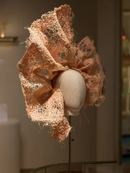 Plant roots grow differently depending on the templates they grow on. From dense, mouldable solid forms to thin lacey flexible fabrics, grassroot bonds with natural fibres to create intricately embroidered fabrics and luxurious plant-based, alternative textiles. Root has a unique aesthetic and readily absorbs natural dyes, allowing for an array of colours and surfaces.