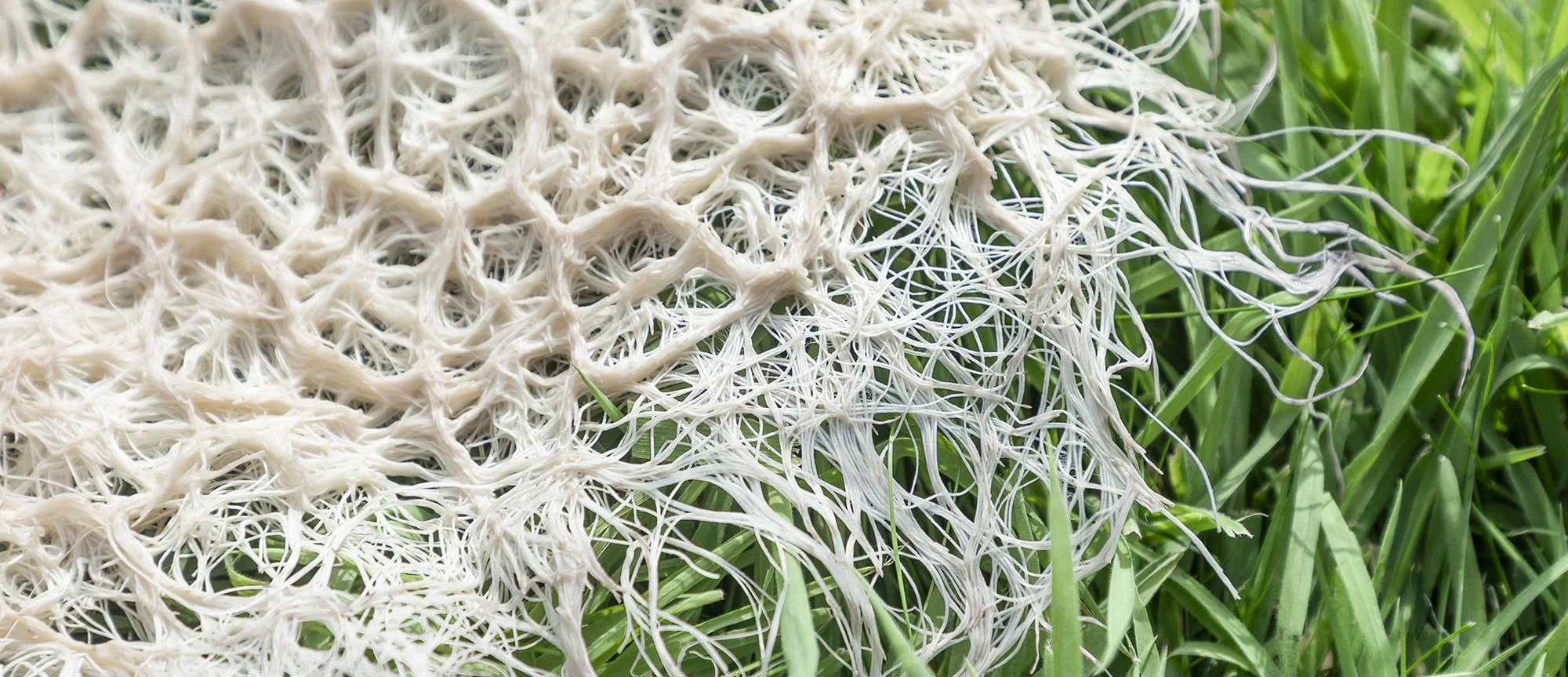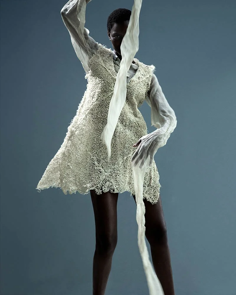Rootfull partnered with British designer Phoebe English to grow a stitch-free dress where bouncy root-grown lace is suspended from a ripped cotton strip bodice. The dress is exhibiting at V&A Dundee's new major exhibition - Garden Futures.