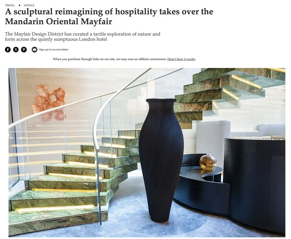 Still Life I (2025) is showcased at 'Elemental Resonance | Nature Reimagined' at the Mandarin Oriental, Mayfair, curated by the Mayfair Design District. The exhibition continues through Frieze London and PAD London and includes site-specific art interventions, alongside a curated selection of artworks displayed throughout the hotel, transforming the space into a living stage.