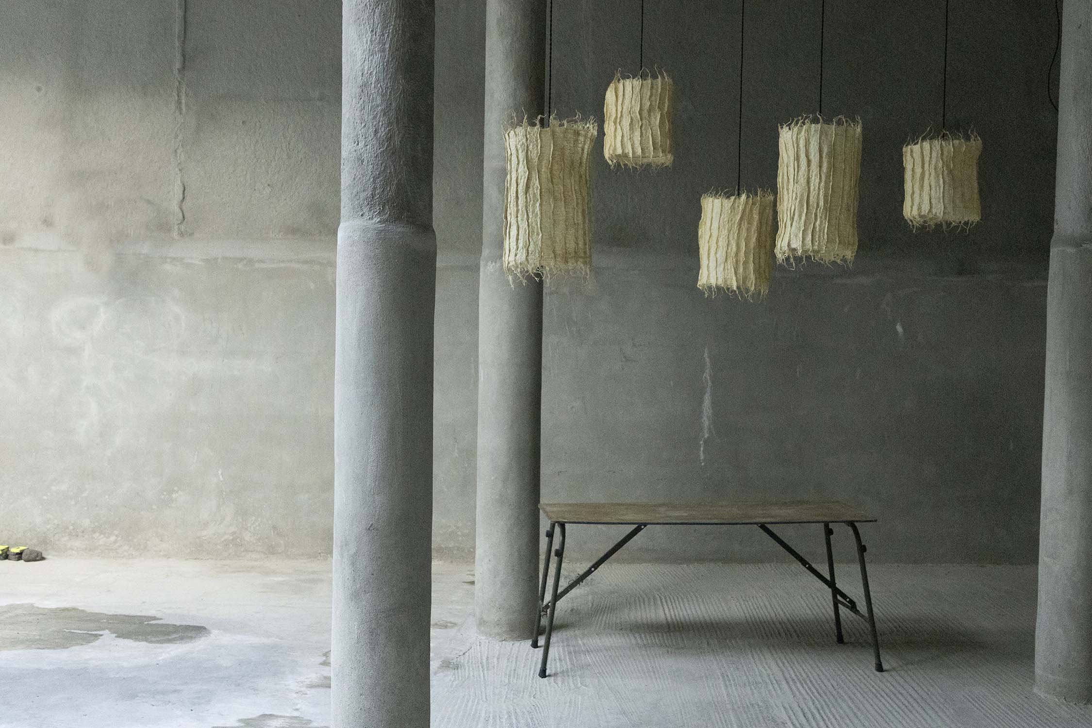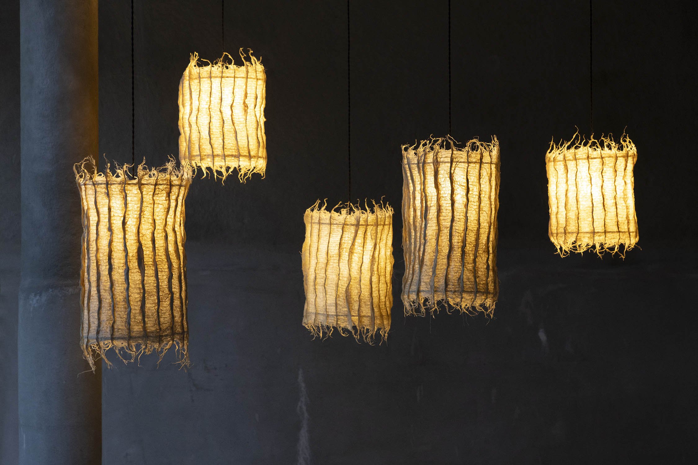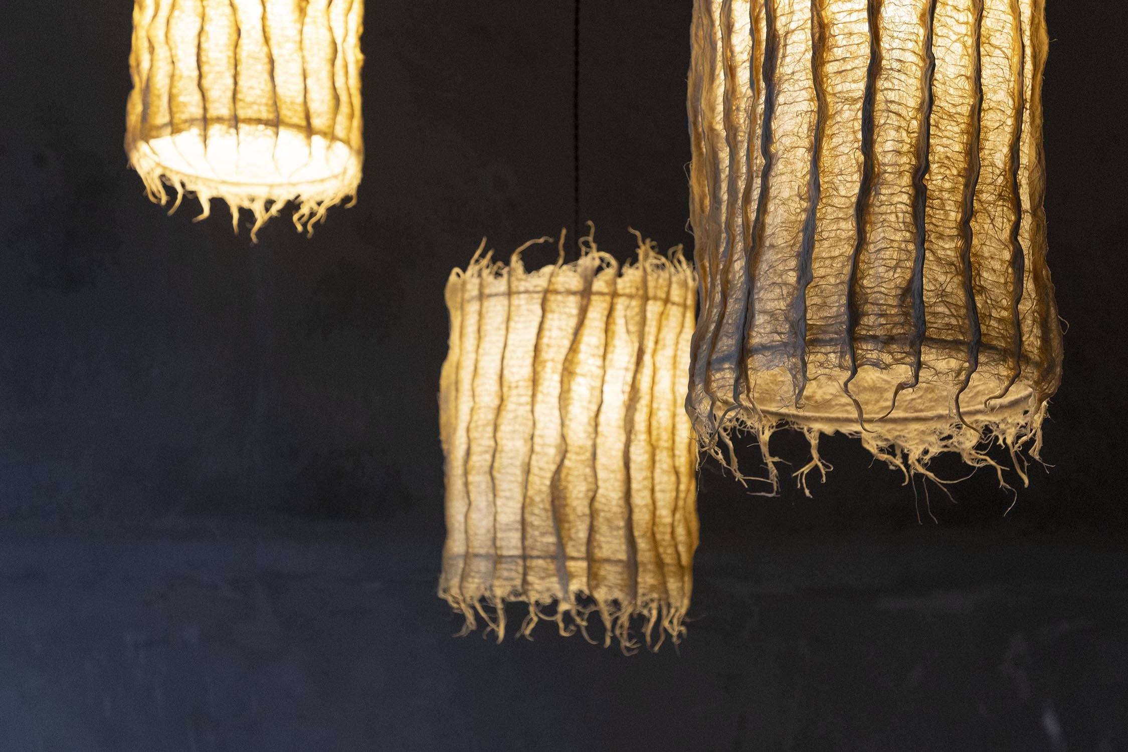 Grass root is cultivated on intricately carved, natural beeswax templates. The plant roots intertwine with each other, creating a robust textile that assumes the shape of the template as it grows.